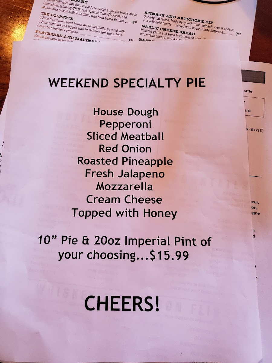 We top this pie with a cheddar cheese blend, sauce it with our special barbecue sauce, roasted chicken, bacon, green peppers, red onions, and drizzle it with honey. Try this pie with cream cheese and jalapeños ask your server